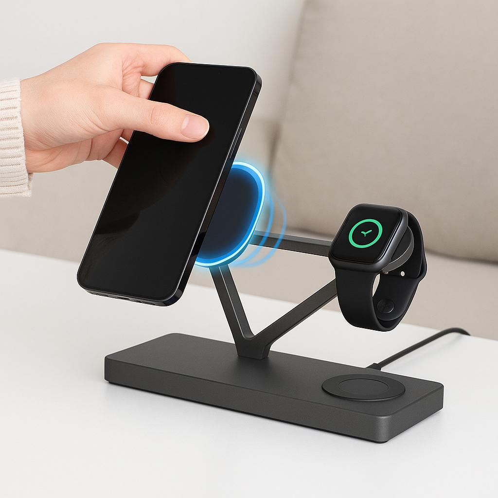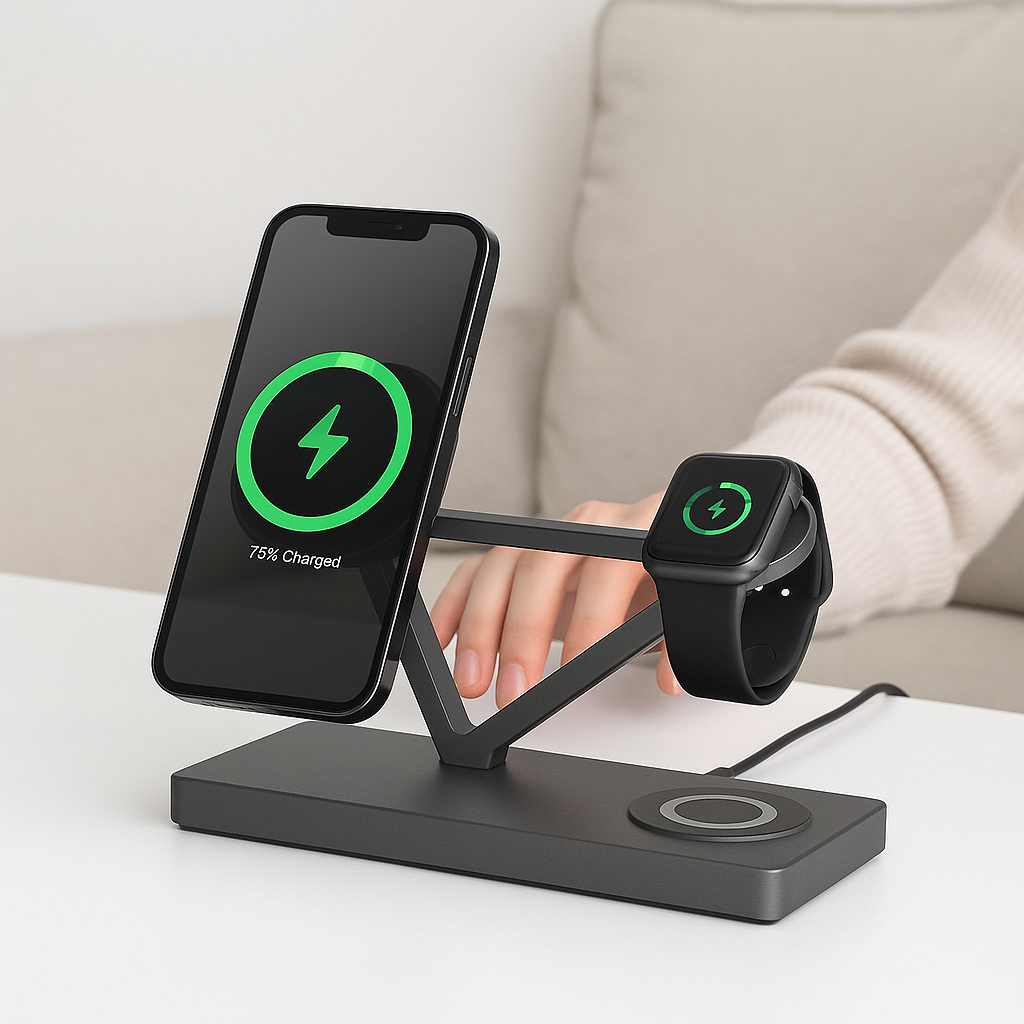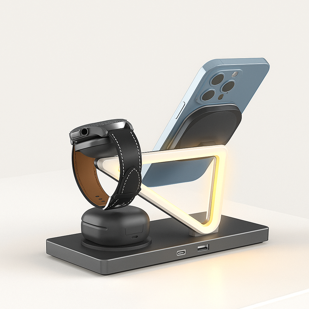 Designed to charge multiple devices at once, it powers your wireless‑charging smartphone, smartwatch, and earbuds—plus offers USB‑wired charging for additional accessories. It supports all Qi-certified devices including iPhones, Samsung Galaxy, Huawei, Google Pixel, Apple Watch, Galaxy Watch, AirPods, and most wireless earphones. If it supports Qi charging, it works seamlessly.